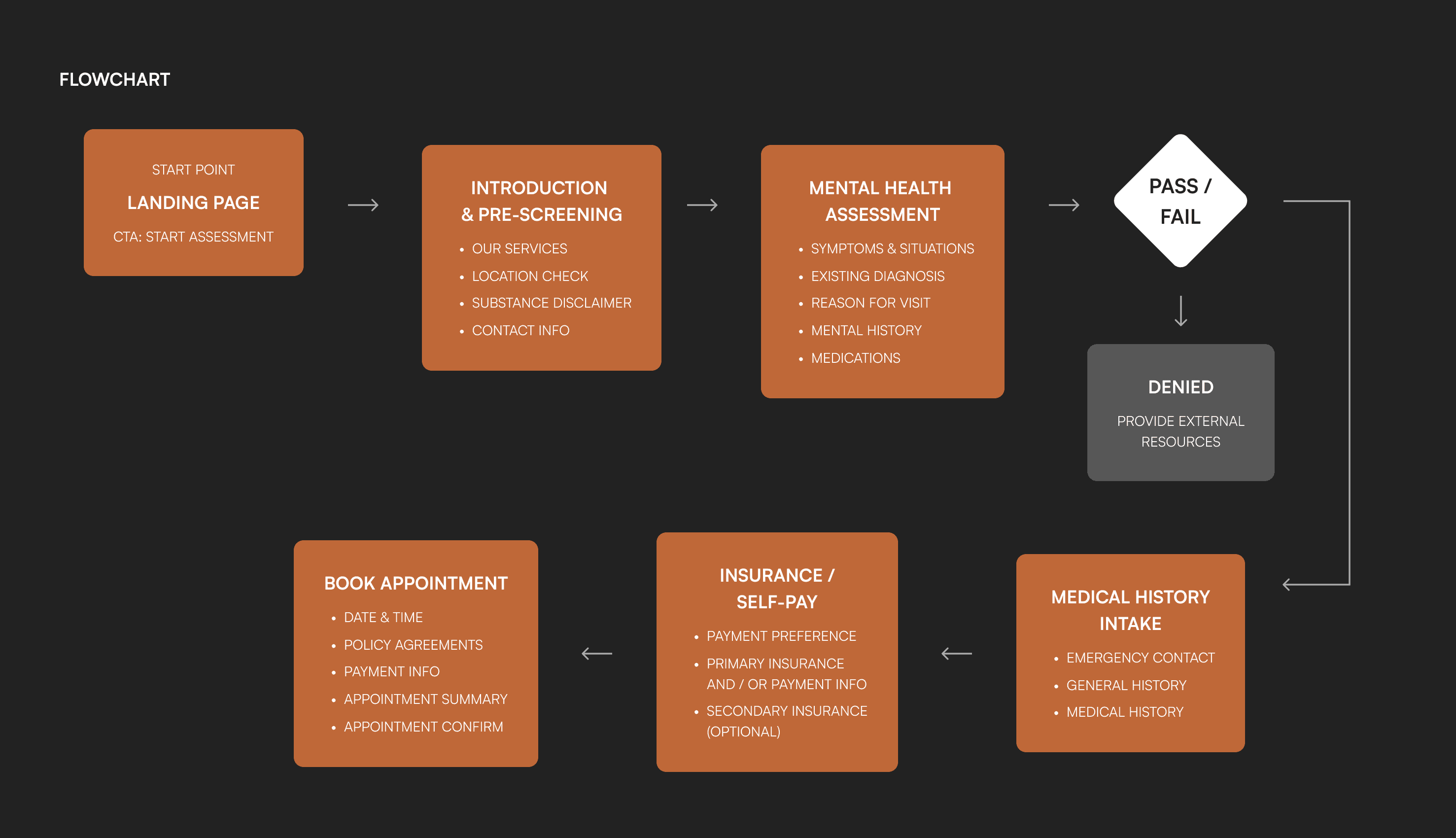 Before jumping to creating wireframes, my clients and I created a detailed flow chart to determine build ability, legal compliance, and usability.